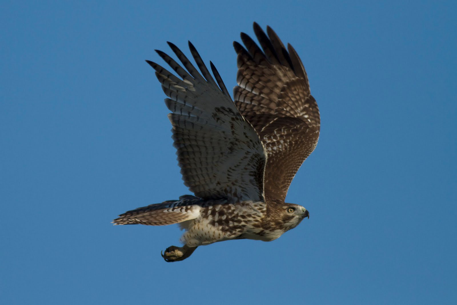 She was hunting a squirrel that was half hidden in the leaf litter below. Red-tailed Hawks soar above open fields, slowly turning circles on their broad, rounded wings. Red tailed hawks have a few field marks that can make them relatively easy to ID, and in this photo the general shape/size combined with the belly band (band of darker feathers across the otherwise white or lightly colored stomach area) definitely make it a red tailed hawk.